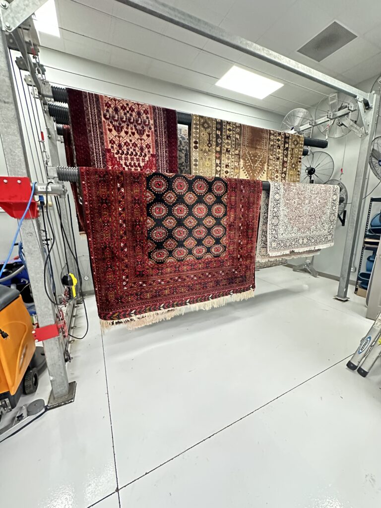 We have a customized dedicated room for drying rugs. Rugs are hung in a dry environmentally control room with airflow heat, and de- humidification.